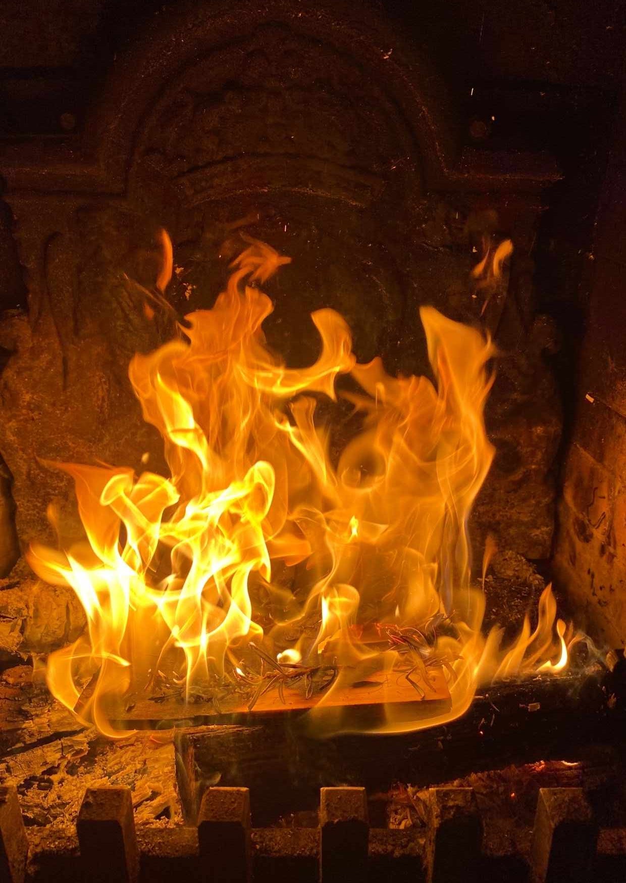 Transformatie kracht spat uit de vlammen, dit is een portaal met medicinale kruiden dat brandt. Een steungevende kaart voor tijden van verandering.
